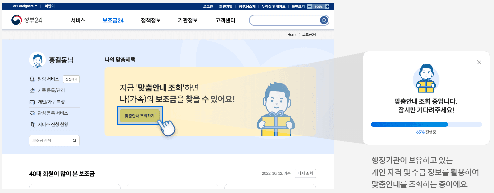 개인별 검색 결과 및 보조금에서 적격 보조금 확인24쉽고 빠르게 직접 신청할 수 있습니다..