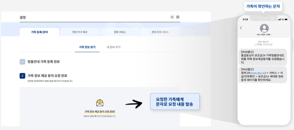 가족의 보조금 요청에 대한 정보를 요청하면 SMS를 통해 안전하게 알림이 전송됩니다.