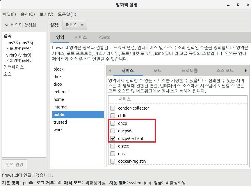 “DHCP”와 파일 시스템을 공유하려면 서버 운영 체제의 방화벽을 비활성화해야 합니다.