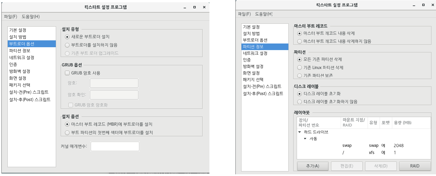 설치가 완료되었으며 “시스템 구성 킥스타트“를 선택하면 Kickstart Configurator 창이 나타나며 다음과 같이 설정됩니다.