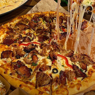 플래터는 이태원에 있는 라이너스 바베큐 느낌이고 피자는 고기가 듬뿍 올려져 있습니다.