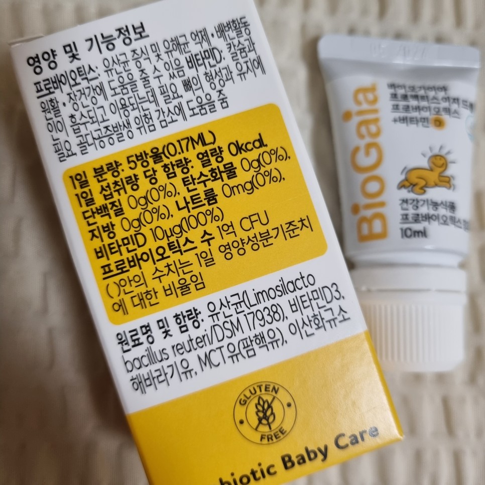 베이비드롭은 유산균만 케어하고 싶을 때 사용하기 좋은 제품! 그것은 모유에서 박테리아 L을 포함합니다. 각종 세균의 혼합물이 아닌 단독으로 1억 개의 엘루테리를 함유하고 있다고 합니다. 또한 우유 및 글루텐 프리 제품으로 유당 알레르기가 있는 어린이도 안심하고 섭취할 수 있습니다. 바이오가이아 프로텍티스 이지 드롭 + 비타민 D 매일 5방울 / 2개월분