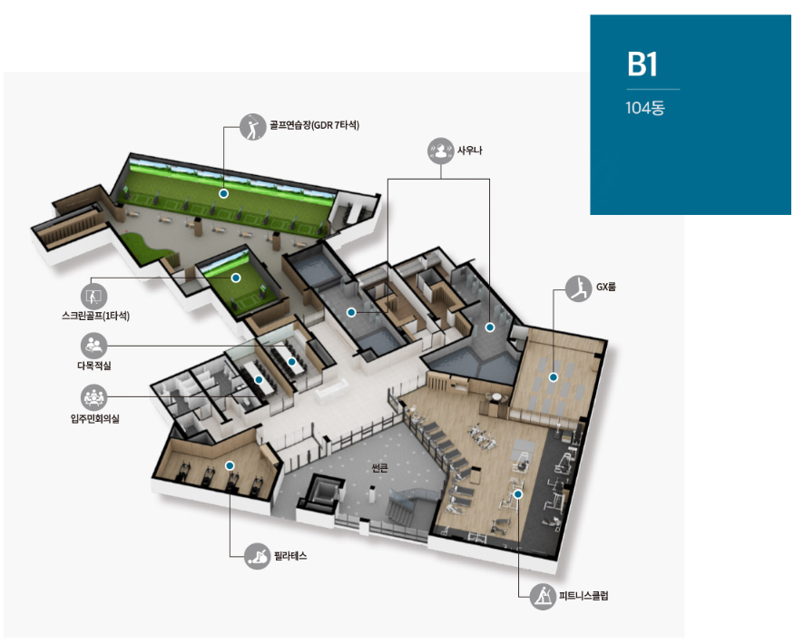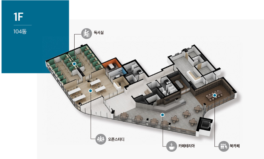 헬스장(GX룸 포함), 실내골프연습장, 북카페, 카페테리아, 오픈스터디, 독서실