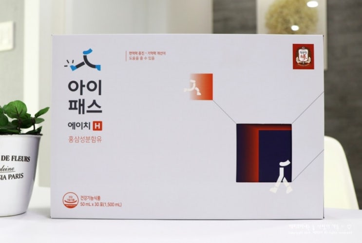 상품명 : 정관장 I-PASS H(30포) 1포 = 50ml 가격 : 16만원 홍삼을 주원료로 면역력 향상 효능 식품의약품안전처 고시, 식물혼합농축액 함유 INGREDIENT MANUFACTURER AND SELLER: KOREAN Ginseng Corp. SELLER: 전국 정관장 매장 및 온라인 정관장몰에서 판매