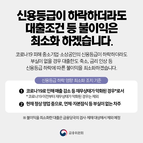 ① 신용등급 4~10등급 *코로나19 피해기업 *소상공인기준 적용 ① 2020년 2월 13일 이전 사업자등록증 소지자 개인 또는 법인사업자 ② 영리사업자 ③ 대출제한 사유에 해당하지 말 것